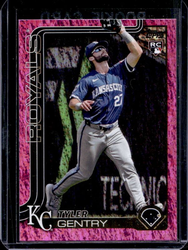 The Tyler Gentry 2025 Topps #6 Pink Holo Foil Rookie card is 1 of 70 Tyler Gentry's card variations in the 2025 Topps set being tracked by Sports Card Investor, including Base, Aqua Holo Foil, Diamante Foil, Holo Foil, and Pink Diamante Foil.