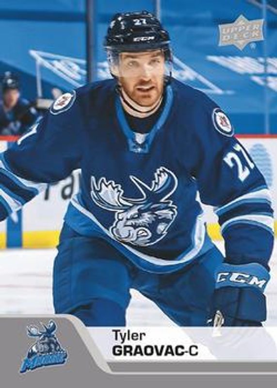 The Tyler Graovac 2020 Upper Deck AHL #125 Base card is 1 of 8 Tyler Graovac's card variations in the 2020 Upper Deck AHL set being tracked by Sports Card Investor, including UD Exclusives /100, UD High Gloss /10, Blue, Printing Plates Black /1, and Printing Plates Cyan /1.