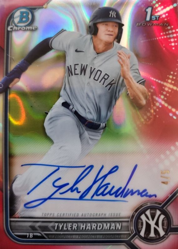 The Tyler Hardman 2022 Bowman #CPA-TH Chrome Prospect Auto - Red Lava Refractor /5 (1st) card in Raw condition has not changed in price in the last 30 days and was last sold for $171.39 .
