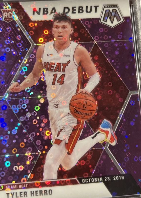The Tyler Herro 2019 Mosaic #280 NBA Debut - Fast Break Purple /50 Rookie card in Raw condition has not changed in price in the last 30 days and was last sold for $18.00 .