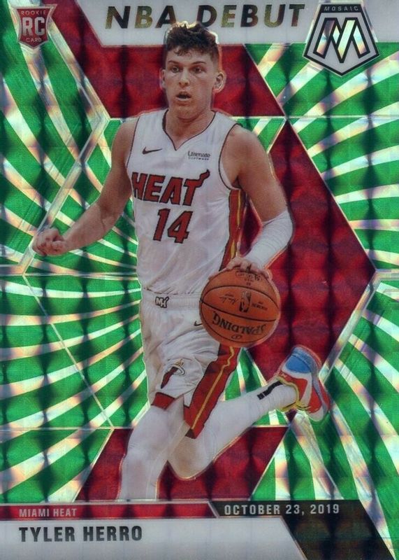 The Tyler Herro 2019 Mosaic #280 NBA Debut - FOTL Green Swirl /10 Rookie card in Raw condition has not changed in price in the last 30 days and was last sold for $51.02 .