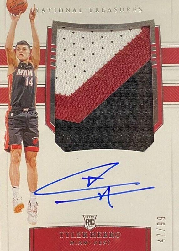 This card is 1 of 8 Tyler Herro's card variations in the 2019 National Treasures set being tracked by Sports Card Investor, including Rookie Patch Auto - Stars & Stripes /30, Rookie Patch Auto - Gold /10, Rookie Patch Auto - Emerald /5, Rookie Patch Auto - Stars & Stripes Blue /3, and Rookie Patch Auto - Logoman /1.