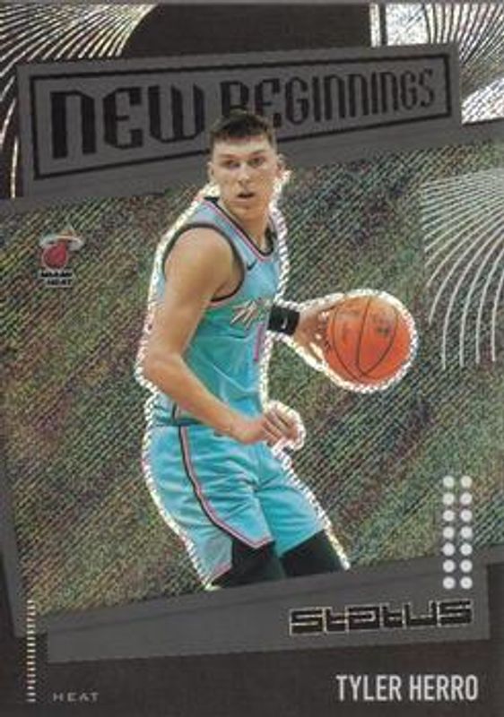 The Tyler Herro 2019 Status #28 New Beginnings Rookie card is 1 of 14 Tyler Herro's card variations in the 2019 Status set being tracked by Sports Card Investor, including Base, Blue, Red, White Diamonds /125, and Green Escher Squares /49.
