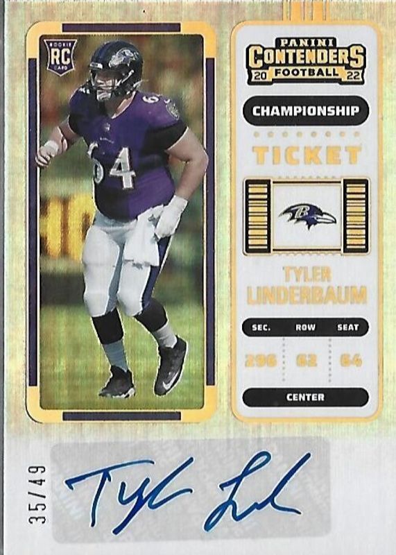 This card is 1 of 14 Tyler Linderbaum's card variations in the 2022 Contenders set being tracked by Sports Card Investor, including Rookie Ticket Auto, Rookie Ticket Auto - Red Zone Ticket, Rookie Ticket Auto - Ticket Stub (/64), Rookie Ticket Auto - Wild Card, and Rookie Ticket Auto - Playoff Ticket /99.