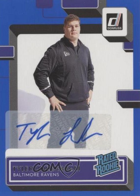 The Tyler Linderbaum 2022 Donruss #400 Rated Rookie Autographs - Blue card in Raw condition has not changed in price in the last 30 days and was last sold for $10.00 .