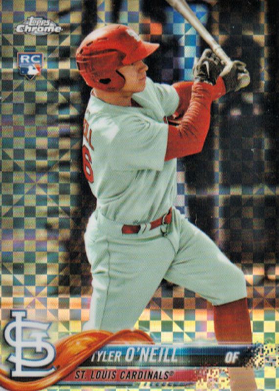 Tyler O'Neill's Baseball cards are available in at least 20 sets. Tyler O'Neill's biggest 7-day price movers are 2018 Topps Chrome #35 X-Fractor, 2018 Topps Heritage #THC-612 Chrome /999, and 2025 Topps Chrome Black #86 Base.