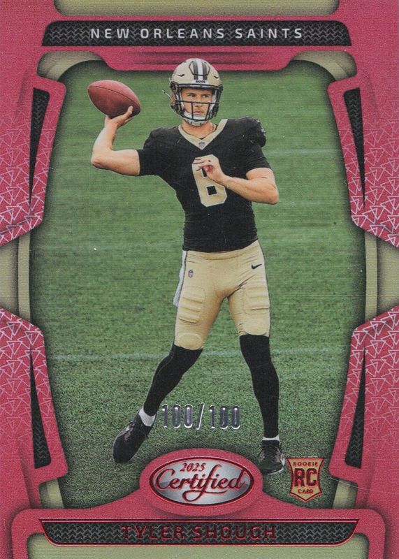 The Tyler Shough 2025 Certified #102 Mirror Red /100 Rookie card in Raw condition has moved up $1.04 (+10.5%) in the last 30 days and was last sold for $10.99 .