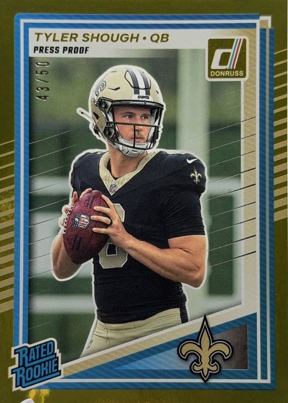 The Tyler Shough 2025 Donruss #304 Press Proof Gold /50 Rookie card in Raw condition has moved up $40.00 (+114%) in the last 30 days and was last sold for $75.00 .