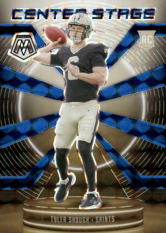 The Tyler Shough 2025 Mosaic #2 Center Stage - Blue /99 Rookie card in Raw condition has moved up $6.51 (+65.1%) in the last 30 days and was last sold for $16.51 .