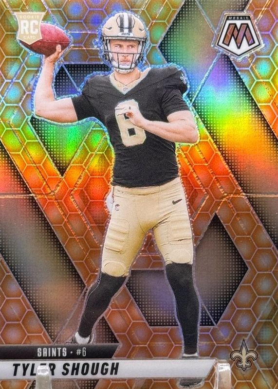 The Tyler Shough 2025 Mosaic #312 Honeycomb /(SSP) Rookie card in Raw condition has moved up $73.10 (+105%) in the last 30 days and was last sold for $142.95 .