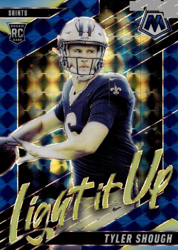 The Tyler Shough 2025 Mosaic #9 Light It Up - Blue /99 Rookie card in Raw condition has moved up $7.52 (+79.2%) in the last 30 days and was last sold for $17.02 .