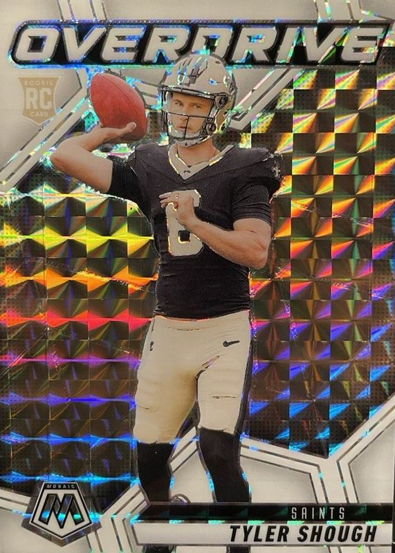 The Tyler Shough 2025 Mosaic #3 Overdrive - White /25 Rookie card in Raw condition has moved down -$14.95 (-49.9%) in the last 30 days and was last sold for $15.00 .