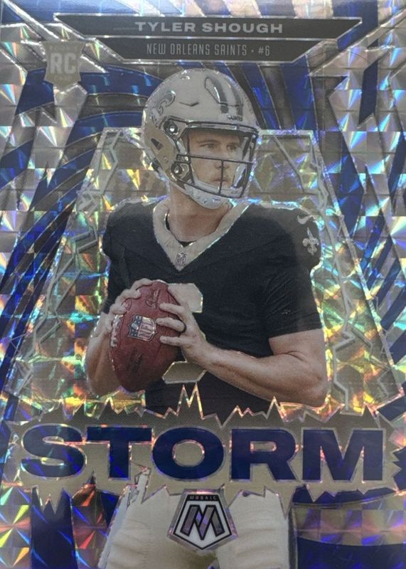 The Tyler Shough 2025 Mosaic #7 Storm - Blue /99 Rookie card in Raw condition has moved up $7.50 (+50.0%) in the last 30 days and was last sold for $22.50 .