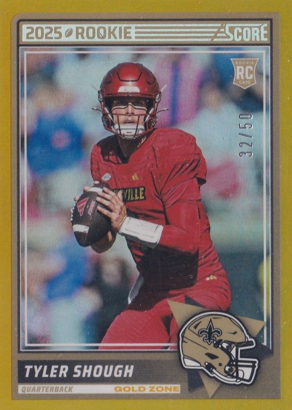 The Tyler Shough 2025 Score #71 Gold Zone /50 Rookie card in Raw condition has moved up $29.99 (+600%) in the last 30 days and was last sold for $34.99 .