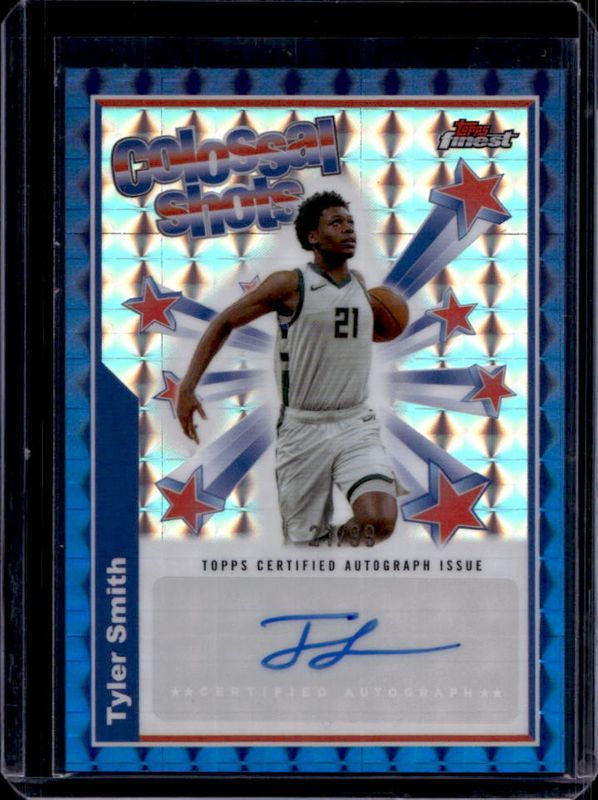 The Tyler Smith 2024 Topps Finest #BSA-TSM Colossal Shots Autographs - Blue Geometric Refractor /99 Rookie card is 1 of 94 Tyler Smith's card variations in the 2024 Topps Finest set being tracked by Sports Card Investor, including Arrivals, Arrivals - Geometric Refractor, Arrivals - Refractor, Arrivals - X-Fractor, and Base Common.