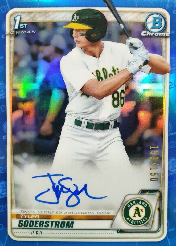 The Tyler Soderstrom 2020 Bowman Draft #CDA-TS Chrome DP Auto - Blue Refractor /150 (1st) card in Raw condition has not changed in price in the last 30 days and was last sold for $155.00 .