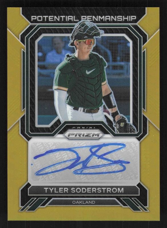 The Tyler Soderstrom 2023 Prizm #PP-TS Potential Penmanship - Gold /10 card is 1 of 45 Tyler Soderstrom's card variations in the 2023 Prizm set being tracked by Sports Card Investor, including Base, Blue Ice, Giraffe, Green Ice, and Hyper.