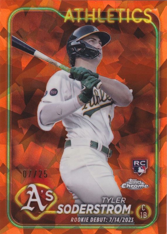 This card is 1 of 7 Tyler Soderstrom's card variations in the 2024 Topps Chrome Update Sapphire Edition set being tracked by Sports Card Investor, including Rookie Debut, Rookie Debut - Gold /50, Rookie Debut - Black /10, Rookie Debut - Red /5, and Rookie Debut - Padparadscha /1.