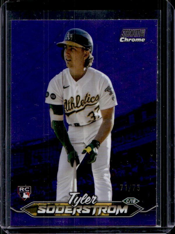 The Tyler Soderstrom 2024 Topps Stadium Club #215 Chrome - Purple Refractor /75 Rookie card is 1 of 36 Tyler Soderstrom's card variations in the 2024 Topps Stadium Club set being tracked by Sports Card Investor, including Base, Design Variations Autographs, Rookie Design Variations Autographs, 1992 Rookie Design Variation, and Black Foil.