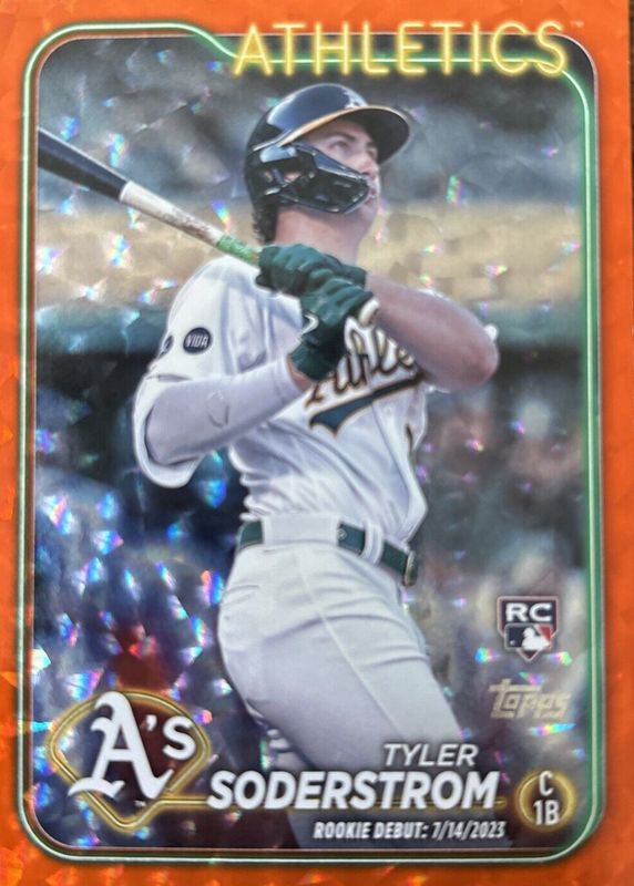 The Tyler Soderstrom 2024 Topps Update #US116 Rookie Debut - Orange Crackle Foilboard /299 card in Raw condition has not changed in price in the last 30 days and was last sold for $0.99 .