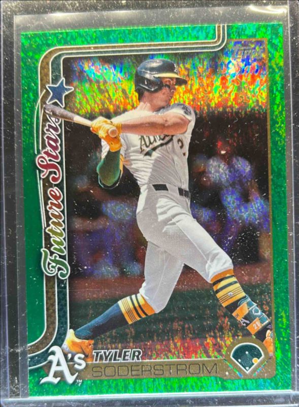 The Tyler Soderstrom 2025 Topps #72 Green Holo Foil /99 card is 1 of 63 Tyler Soderstrom's card variations in the 2025 Topps set being tracked by Sports Card Investor, including Base, Aqua Holo Foil, Diamante Foil, Holo Foil, and Pink Diamante Foil.