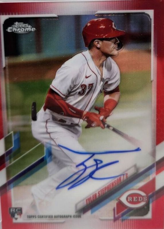The Tyler Stephenson 2021 Topps Chrome #RA-TS Rookie Auto - Red Refractor /5 card in Raw condition has not changed in price in the last 30 days and was last sold for $325.00 .