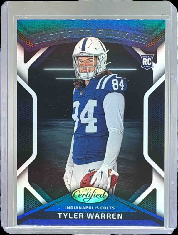 The Tyler Warren 2025 Certified #CRK-TWN Certified Rookies card is 1 of 100 Tyler Warren's card variations in the 2025 Certified set being tracked by Sports Card Investor, including Base Rookie /499, Mirror /399, Mirror Purple /299, Mirror Pink /225, and Mirror Orange /150.