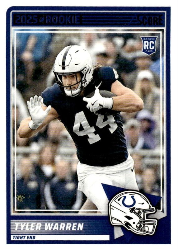 The Tyler Warren 2025 Score #21 Base Rookie card in Raw condition has moved up $1.85 (+187%) in the last 30 days and was last sold for $2.84 .