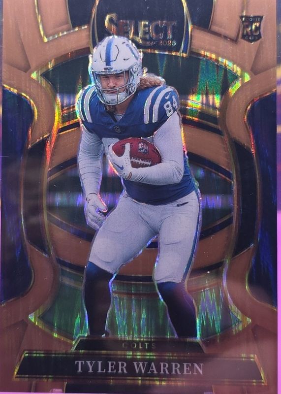 The Tyler Warren 2025 Select #33 Concourse Copper Shock /899 Rookie card in Raw condition has moved up $4.06 (+103%) in the last 30 days and was last sold for $7.99 .