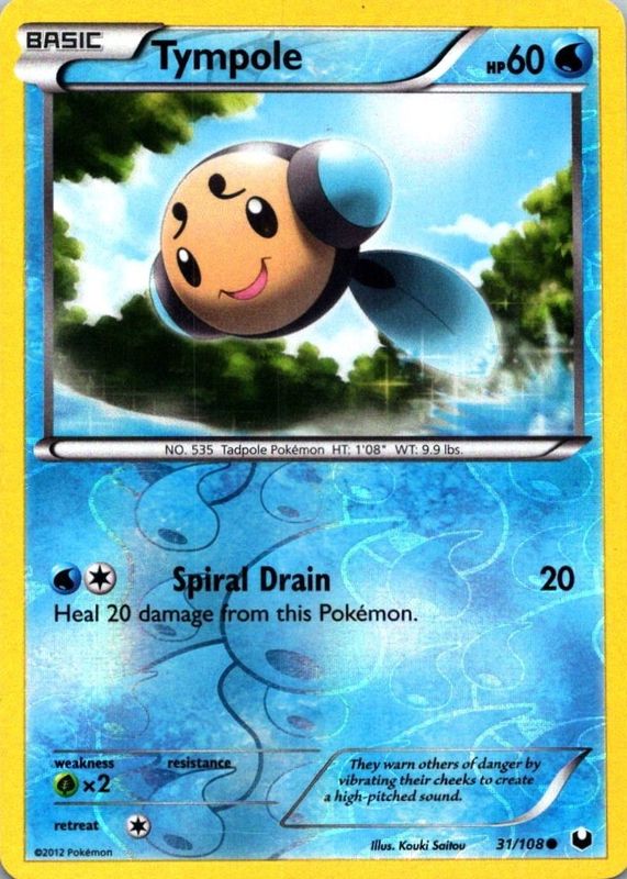 The Tympole 2012 Black & White: Dark Explorers #031/108 Reverse Holo card in Raw TCG (Lightly Played) condition has not changed in price in the last 30 days and was last sold for $1.99 .