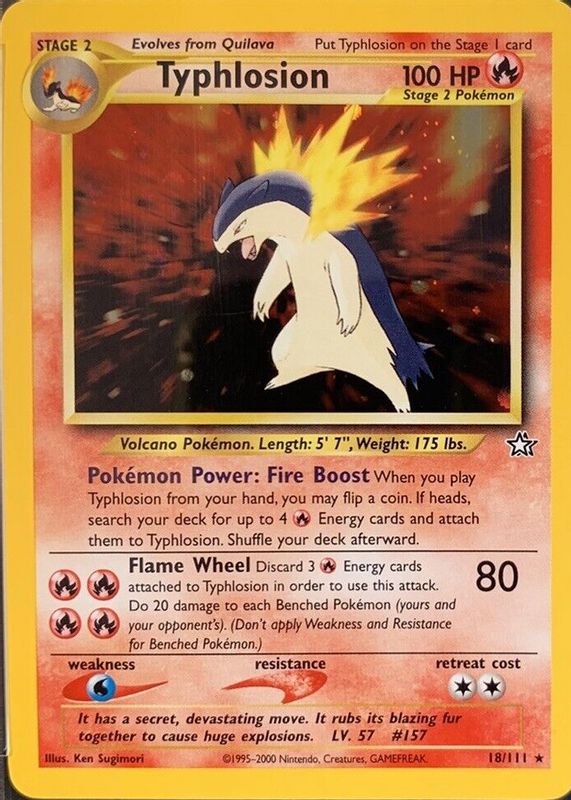 The Typhlosion 2000 Neo Genesis #18/111 Holo card in Raw TCG (Lightly Played) condition has moved down -$39.99 (-57.1%) in the last 30 days and was last sold for $30.00 .