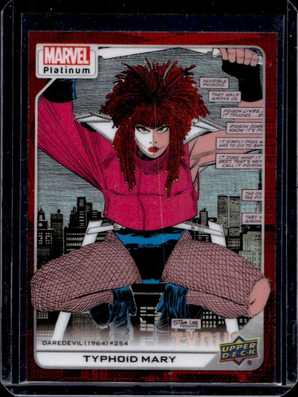 The Typhoid Mary 2023 Upper Deck Marvel Platinum #143 Red Rainbow card is 1 of 30 Typhoid Mary's card variations in the 2023 Upper Deck Marvel Platinum set being tracked by Sports Card Investor, including Base, Black Rainbow, Blue Rainbow, Blue Surge, and Purple Rainbow.