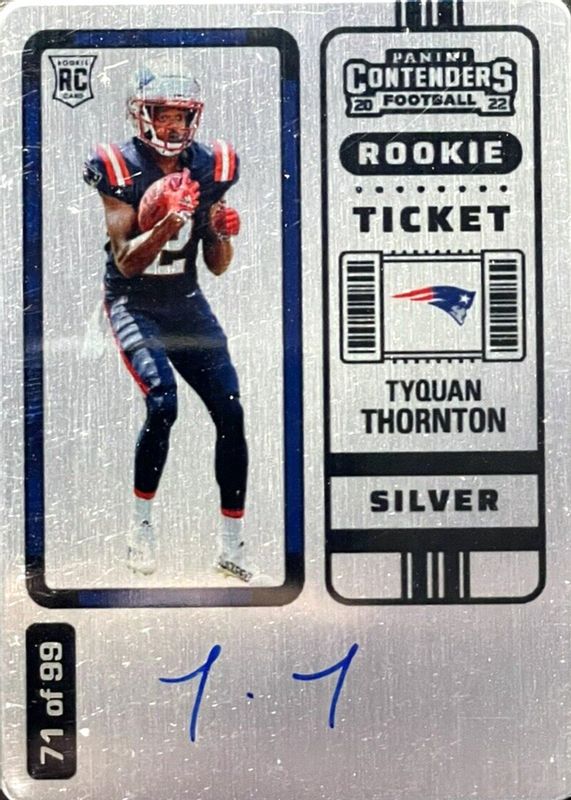 The Tyquan Thornton 2022 Contenders #138 Rookie Ticket Auto - Silver (/99) card in Raw condition has not changed in price in the last 30 days and was last sold for $5.00 .