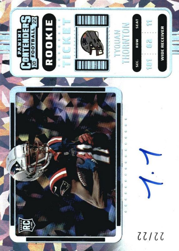 This card is 1 of 28 Tyquan Thornton's card variations in the 2022 Contenders set being tracked by Sports Card Investor, including Rookie Ticket Auto, Rookie Ticket Auto - Red Zone Ticket, Rookie Ticket Auto - Silver (/99), Rookie Ticket Auto - Ticket Stub (/11), and Rookie Ticket Auto - Wild Card.