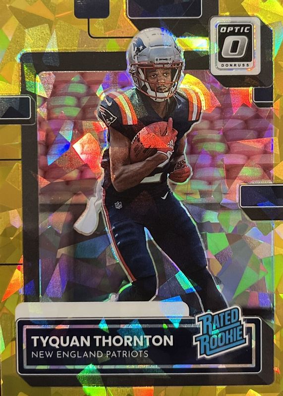 The Tyquan Thornton 2022 Donruss #P-322 Optic Preview - Gold Ice /10 Rookie card in Raw condition has not changed in price in the last 30 days and was last sold for $49.00 .