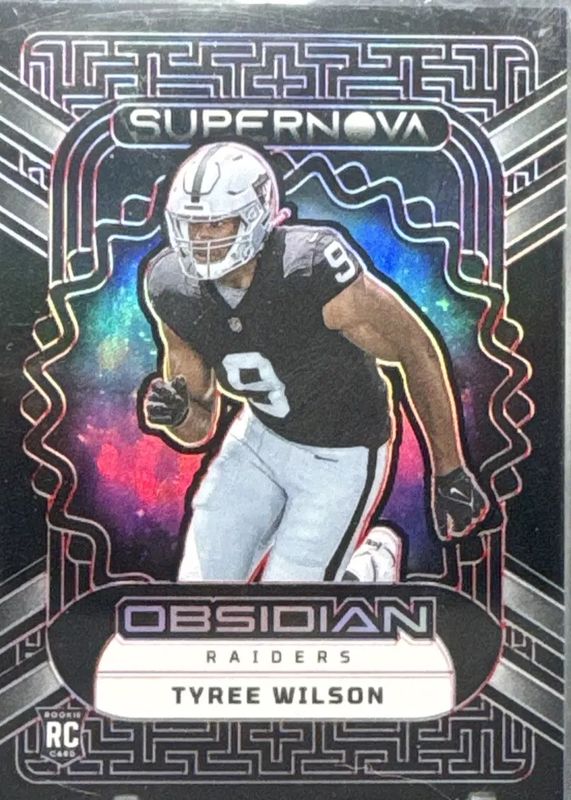 The Tyree Wilson 2023 Obsidian #24 Supernova - Electric Etch Red /10 Rookie card in Raw condition has not changed in price in the last 30 days and was last sold for $5.00 .