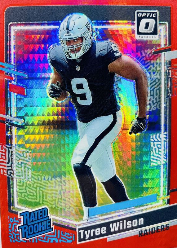 The Tyree Wilson 2023 Optic #262 Red Hyper Rookie card in Raw condition has not changed in price in the last 30 days and was last sold for $0.99 .