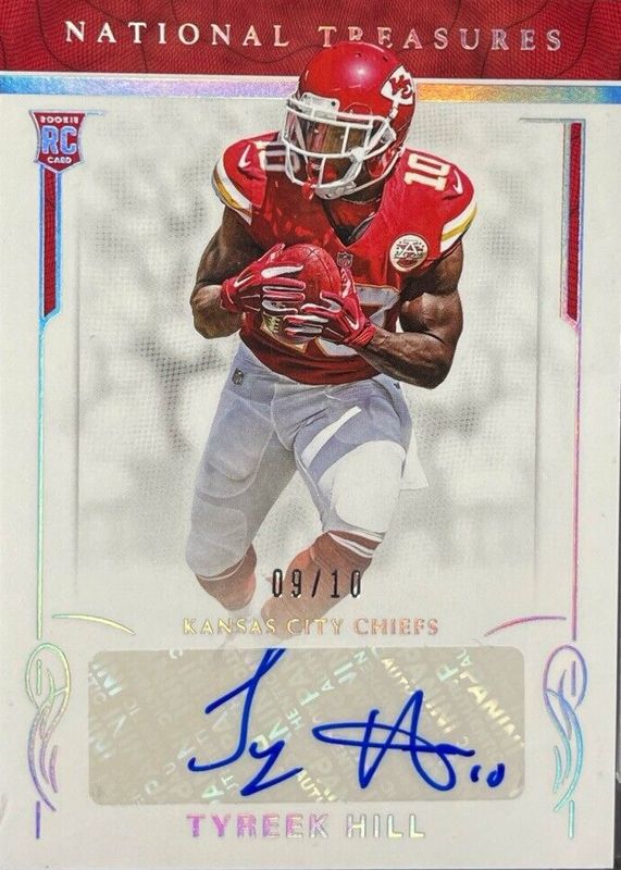 This card is 1 of 12 Tyreek Hill's card variations in the 2016 National Treasures set being tracked by Sports Card Investor, including Rookie Signatures (/49), Rookie Signatures - Emerald (/3), Rookie Signatures - Gold (/25), Rookie Signatures - Holo Gold (/5), and Rookie Signatures - Jersey Number Red (/10).