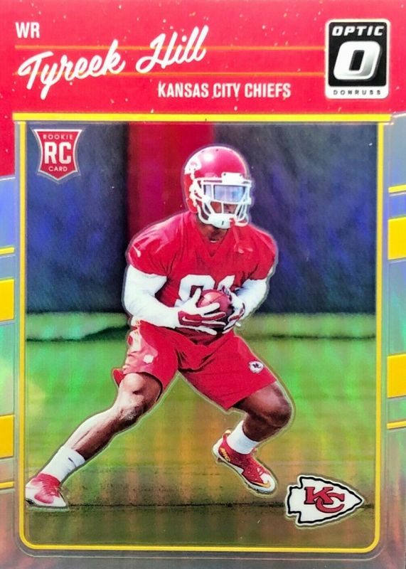 The Tyreek Hill 2016 Optic #117 Holo Rookie card in Raw condition has moved up $7.75 (+63.3%) in the last 30 days and was last sold for $20.00 .