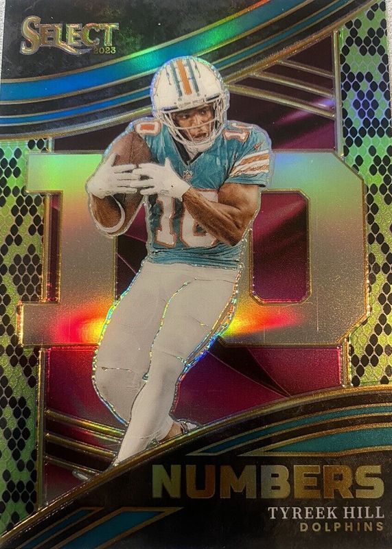 The Tyreek Hill 2023 Select #NMB-THI Select Numbers - Green & Black Snakeskin /2 card in Raw condition has not changed in price in the last 30 days and was last sold for $118.07 .