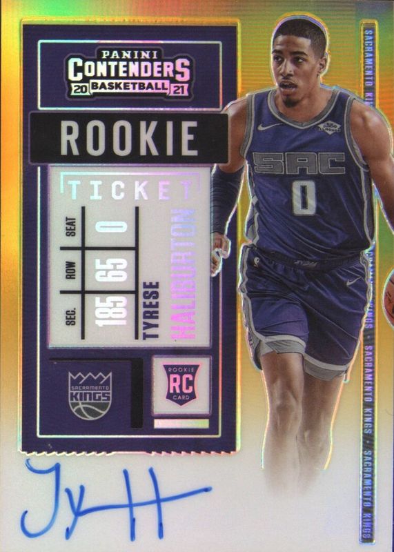 The Tyrese Haliburton 2020 Contenders #129 Rookie Ticket Auto - Premium Gold /10 (Purple Jersey) card in Raw condition has not changed in price in the last 30 days and was last sold for $3,360.00 .