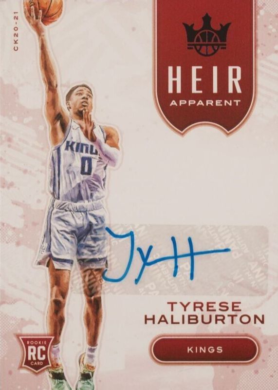 The Tyrese Haliburton 2020 Court Kings #HA-THA Heir Apparent Autographs - Violet (/49) Rookie card in Raw condition has not changed in price in the last 30 days and was last sold for $159.06 .