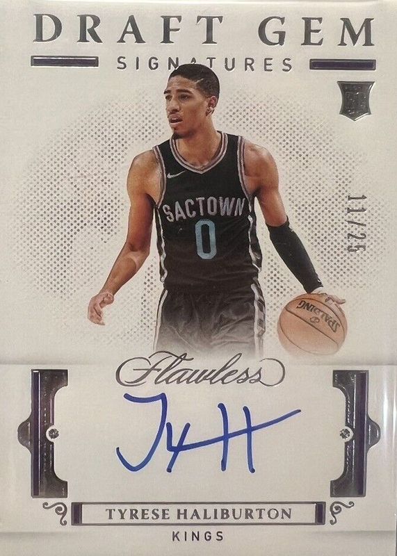 The Tyrese Haliburton 2020 Flawless #DG-TRH Draft Gem Signatures /25 Rookie card in Raw condition has not changed in price in the last 30 days and was last sold for $1,000.00 .