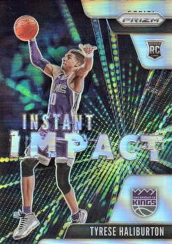 The Tyrese Haliburton 2020 Prizm #9 Instant Impact - Silver Rookie card is 1 of 79 Tyrese Haliburton's card variations in the 2020 Prizm set being tracked by Sports Card Investor, including #262 Base, #262 Choice Blue Yellow Green, #262 Fast Break, #262b Fast Break, and #262 Green.
