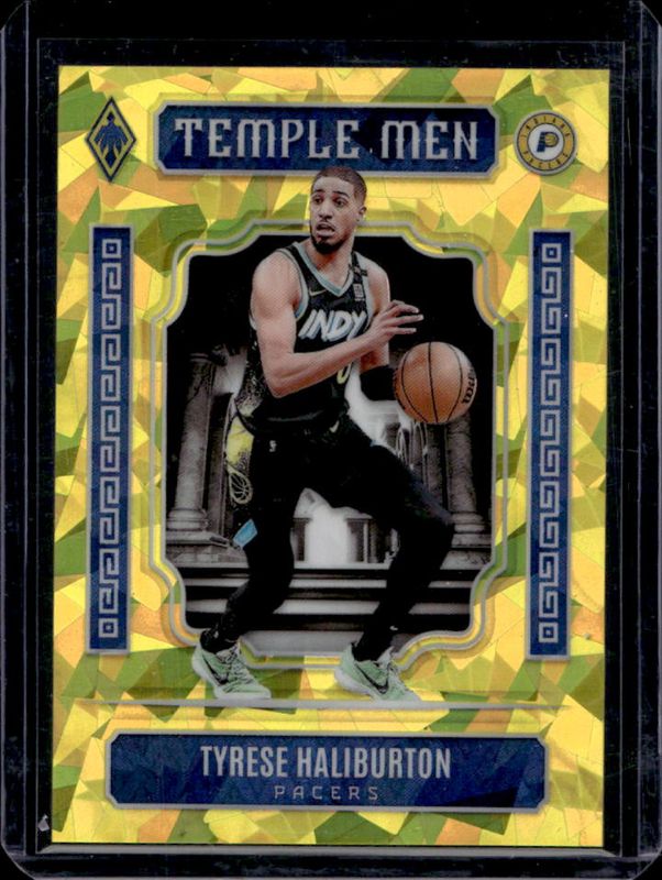 The Tyrese Haliburton 2023 Phoenix #8 Temple Men - Yellow Ice /175 card is 1 of 165 Tyrese Haliburton's card variations in the 2023 Phoenix set being tracked by Sports Card Investor, including Base, Blue Ice, Color Burst, Dream Weaver, and Hieroglyphs.