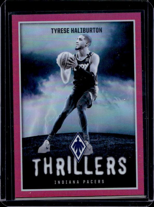 The Tyrese Haliburton 2023 Phoenix #21 Thrillers - Pink /99 card is 1 of 165 Tyrese Haliburton's card variations in the 2023 Phoenix set being tracked by Sports Card Investor, including Base, Blue Ice, Color Burst, Dream Weaver, and Hieroglyphs.