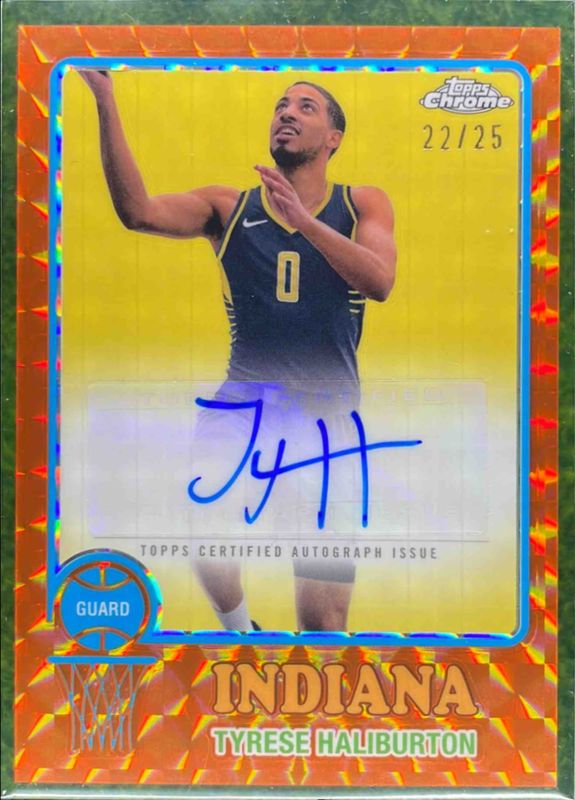 The Tyrese Haliburton 2024 Topps Chrome #73TA-TH 1973 Autographs - Orange Geometric Refractor /25 card is 1 of 99 Tyrese Haliburton's card variations in the 2024 Topps Chrome set being tracked by Sports Card Investor, including Base, Blue Basketball Refractor, Magenta Refractor, Negative Refractor, and Pink Basketball Refractor.
