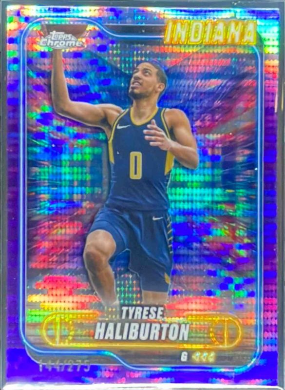 The Tyrese Haliburton 2024 Topps Chrome #100 Purple Sonar Refractor /275 card is 1 of 99 Tyrese Haliburton's card variations in the 2024 Topps Chrome set being tracked by Sports Card Investor, including Base, Blue Basketball Refractor, Magenta Refractor, Negative Refractor, and Pink Basketball Refractor.