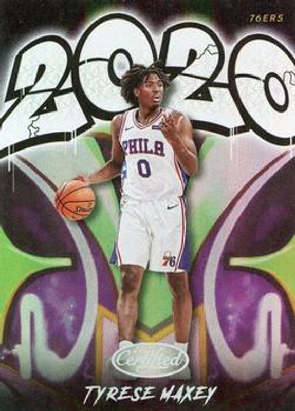 The Tyrese Maxey 2020 Certified #10 2020 Graffiti Rookie card is 1 of 37 Tyrese Maxey's card variations in the 2020 Certified set being tracked by Sports Card Investor, including #180 Base, #96 Asia Exclusive, #180 Asia Exclusive, #180 Asia Exclusive Gold, and #96 Asia Exclusive Gold.