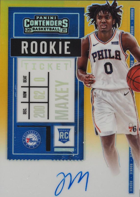 The Tyrese Maxey 2020 Contenders #123 Rookie Ticket Auto - Premium Gold /10 (No Ball) card in Raw condition has not changed in price in the last 30 days and was last sold for $1,425.00 .